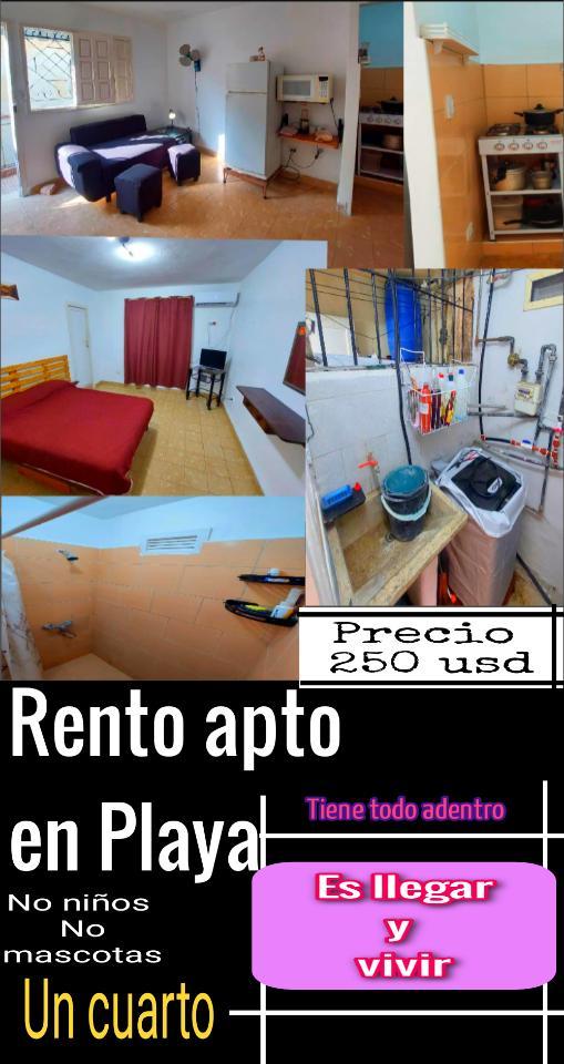 Se renta apartamento en playa, calle 50 y 41. Semi interior, planta baja. Zona céntrica cerca de mercados, gyms, hospitales.El apto consta de sala cocina, patio de lavado, 1 habitación y baño. Cuenta con Habitación climatizada, gas de la calle, agua 24 horas, ducha con calentador por gas, servicio de televisión por cable.