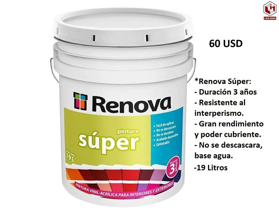 RENOVA SUPER blanca Pintura Vinil-Acrílica, para interiores y exteriores, resistente al intemperismo. Garantia de 3 años . Tiene un acabado terso y mate, gran rendimiento y poder cubriente, no se descascara, además protege y embellece la superficie donde se aplica y se adhiere a los principales materiales de construcción. Pintura certificada en norma de pinturas