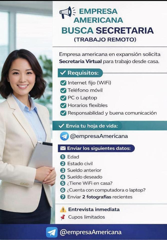 Se busca secretaria para trabajo remoto en empresa americana, interesadas llamar al móvil 56849093 o escribir por Whatsapp.
